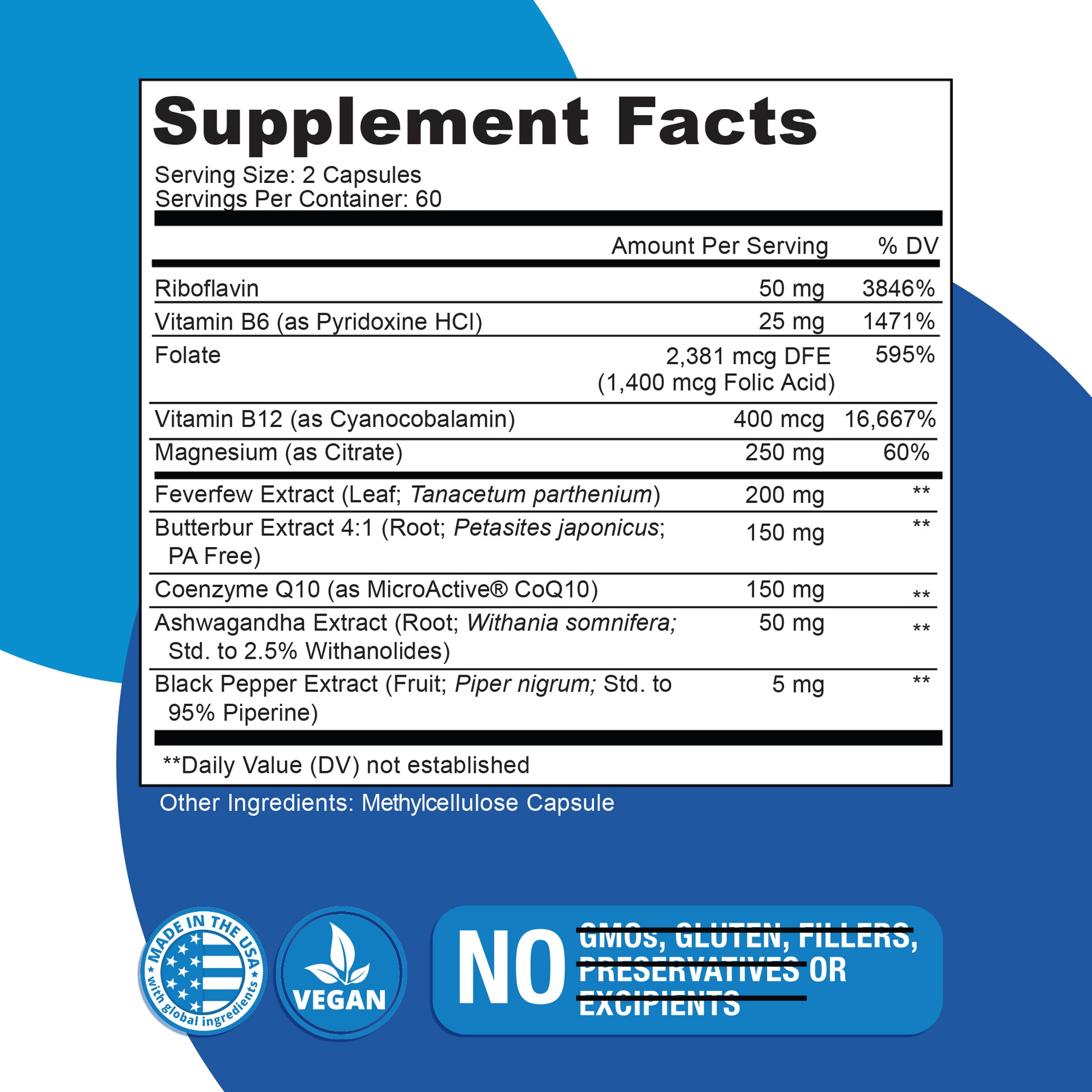 - SAY GOODBYE TO THROBBING HEADACHES with essential measures of Butterbur, COQ10, Feverfew, Riboflavin and Magnesium, all shown in clinical studies to help allay migraine frequency and onset. Compare our complex formula with leading brands!